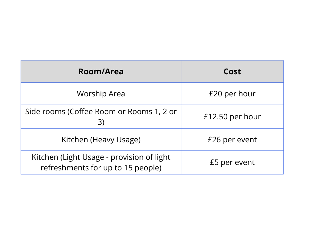 The standard rates are shown below. Discounted rates are available (e.g., for certain charity events). Please contact the church office using the enquiry form to discuss this further.